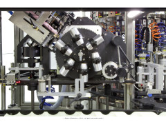 - Exakten und zuverlässigen automatischen Kapselaufsetzer mit drehenden Köpfen (mechanische Kurvensteuer-Bewegung in elliptischer Form) für die Erfassung der Kapseln vom Magazin bis zur Flasche. Vor dem Aufsetzen in den Köpfen, werden die Kapseln mittels eines mechanischen Systems erfasst.